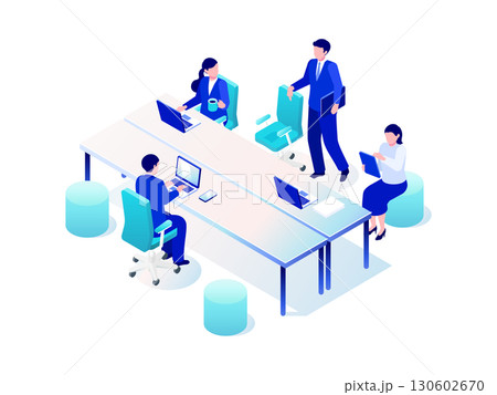 フリーアドレスオフィスの柔軟なワークスペース – アイソメトリックイラスト