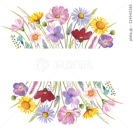 ポピーの花畑のおしゃれフレーム。水彩イラストを使用。
