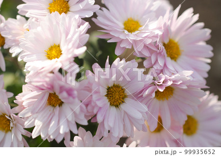 太陽の自然光を受ける上品な桜色のスプレーマム(スプレー菊)の花たち。