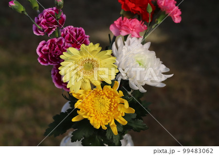 花瓶に飾った白と黄色の菊の花と黄色いガーベラの花とピンク色のカーネーションの花