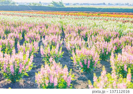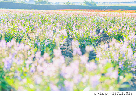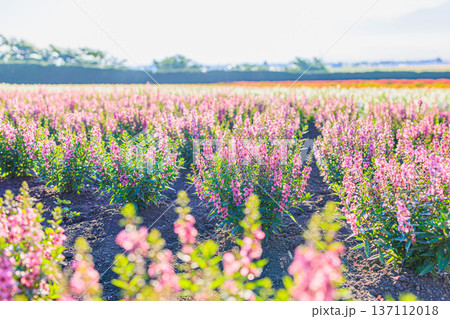 北海道・ファーム富田の花畑 朝の光に輝く色とりどりの花のライン