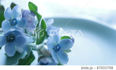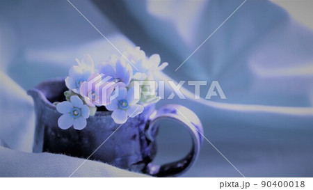 全体的に青みがかった早朝をイメージさせる素材 霧がかった早朝のイメージ ヴィンテージカップに入れた花