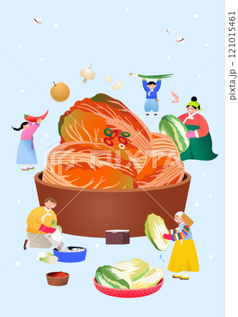Kimchi is placed in a large basin and people around are wearing hanbok and making kimchi.