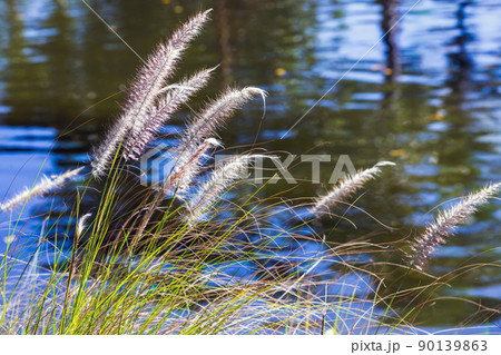 Coastal grass and blurred lake water background. Cenchrus setaceus