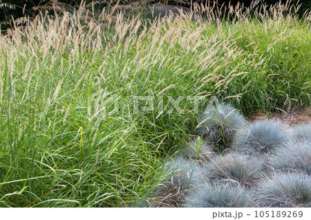 Pennisetum alopecuroides or fountaingrass flowering and Festuca glauca or blue fescue plants