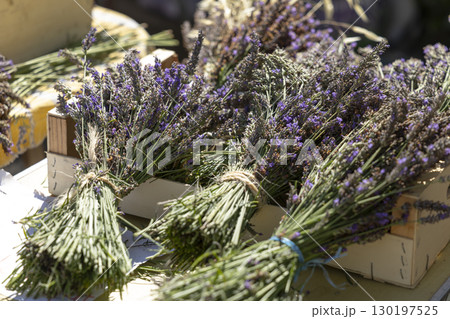 Fresh lavender bouquets lying in wooden crates at a French market in Nyons