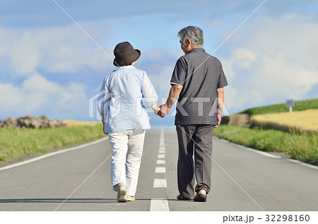 手を取り合って一本道を歩くシニアの夫婦