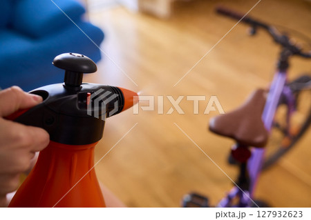 Engaging in Bicycle Cleaning with a Convenient Spray Bottle in a Cozy Environment Space
