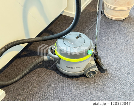 Professional carpet cleaner. Vacuum cleaner on gray floor