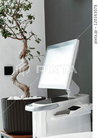 Modern medical equipment in a bright waiting area featuring a potted plant