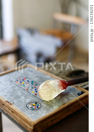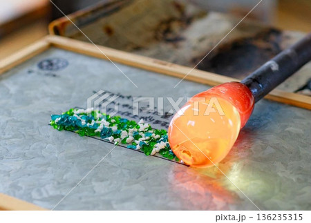 溶けたガラスと色ガラスを使った吹きガラス体験の制作風景