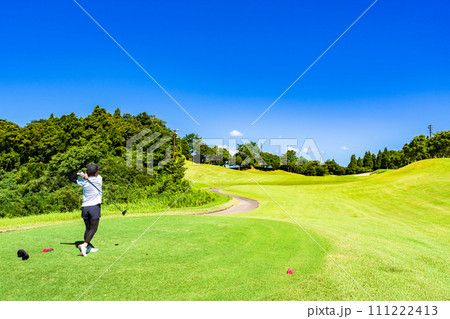 ゴルフ場のティグラウンドでドライバーショットを打つ男性の後姿(千葉県木更津市)