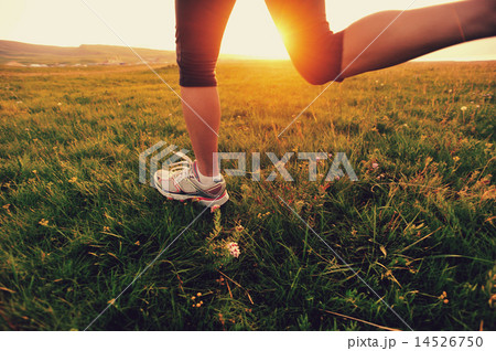 Runner athlete running on grass seaside. woman fitness sunrise/sunset jogging workout wellness conce