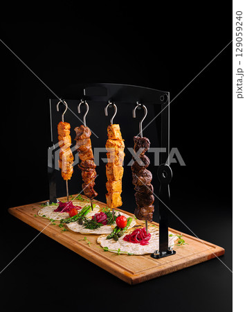Meat set for a large group. A dish of different types of meat: beef steak, pork cuts and ribs, chicken kebab and grilled quail, lamb ribs. Menu for a pub on a dark background.