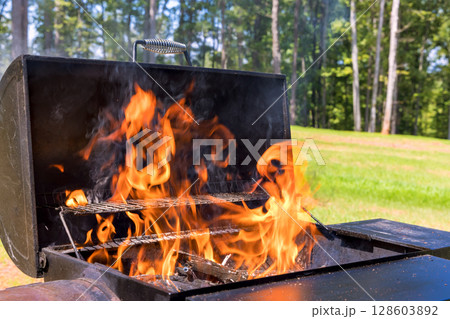 Flames dance from barbecue grill as summer sun shines down in green backyard.