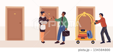 Man with suitcases checks into hotel room. Hostel service. Guesthouse accommodation. Bellman with baggage cart. Maid giving keys to tourist. Motel staff hospitality. Vector concept
