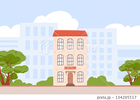Three story city hotel against backdrop of cityscape with high rise building. Urban architecture. Motel house. Hostel entrance. Guesthouse facade. Guest accommodation. Vector background