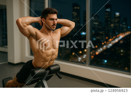 AI generated athletic man training back muscles at night in clean gym with city lights view through large glass windows creating a calm focused atmosphere
