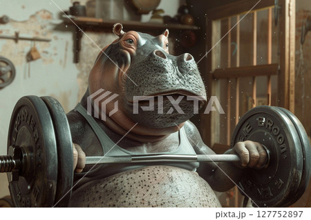 Funny cartoon hippo lifting a heavy barbell in an old gym, showing strength, humor, and determination.