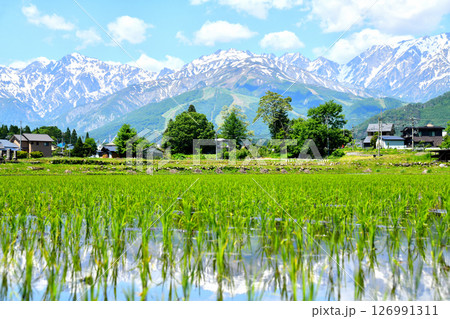 小谷村 越戸峰の棚田と水鏡に映える残雪の白馬三山