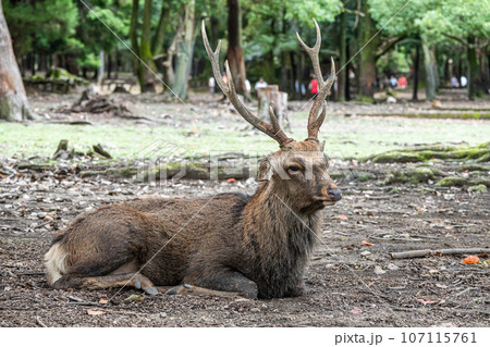 ニホンジカ 牡鹿が木陰でしゃがんで休んでいる
