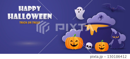Happy Halloween banner with cute pumpkins, ghosts, bats and cauldron. Paper cut style