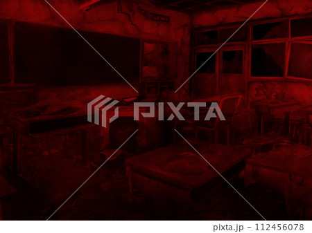 廃墟の荒れた教室の赤いイラスト
