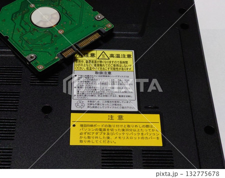 ノートパソコンの底に貼られてる「高温注意」のシールとHDD