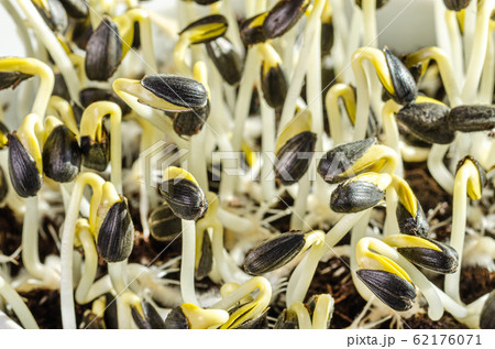 Sunflower sprouts in the sunlight, macro food photo. Sprouts and microgreen of Helianthus annuus, the common sunflower. Edible seedlings and young plants. Closeup.