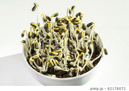 Sunflowers sprouting in a white bowl and growing in potting compost. Sprouts and microgreen of Helianthus annuus, the common sunflower. Edible seedlings and young plants. Macro food photo, closeup.