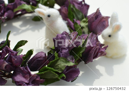 クリスマスローズの花のリースとフェルトのウサギ