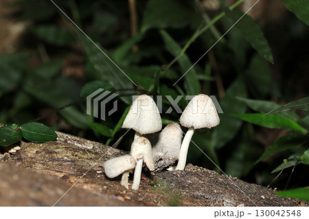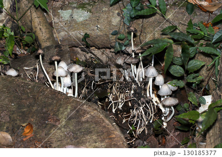 森の朽木影にヒトヨタケ茸がコロニーを形成(アウトドアフィールド菌&キノコ類マクロ撮影)