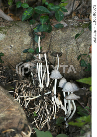 森の朽木に自己溶解するヒトヨタケ茸コロニー(縦長・アウトドアフィールド菌&キノコ類マクロ撮影)