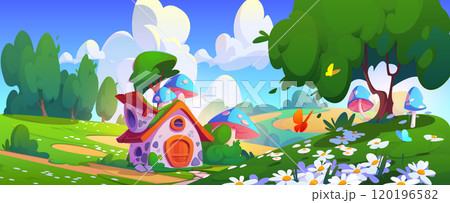 Cartoon hut on tree trunk nature landscape, vector cute fairy tale village wooden house with ladder, potted plants, road