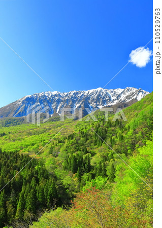 【鳥取県】三の沢から見た冠雪した大山と新緑