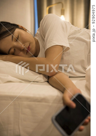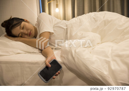 寝室でスマホを持ったまま寝落ちしてしまった若い女性