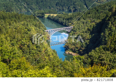 只見川の特徴的な赤い橋梁と青空のコントラスト自然の緑が美しい