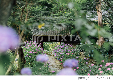 森町にある極楽寺 あじさい寺の梅雨に咲く紫陽花と赤い橋(静岡県)