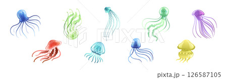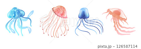 Jellyfish with Multiple Long Tentacles Isolated on White Background Vector Set