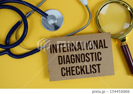 International Diagnostic Checklist (IDC) text on paper card with Stethoscope flat lay on yellow background