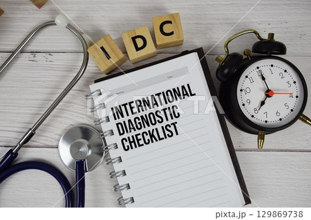 IDC International Diagnostic Checklist acronym on notepad, Healthcare and Medical concept background