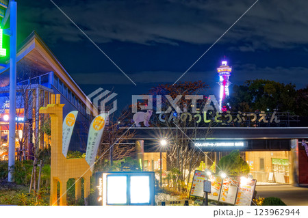 冬の天王寺公園のイルミネーションと通天閣の夜景