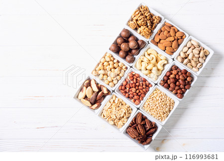 Mix of nuts. Almonds, cashews and pumpkin seeds in a bowl and scattered on a white wooden background