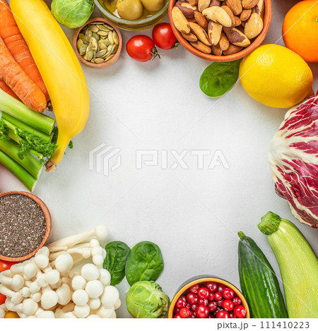 Healthy food fruit, vegetable, seeds, superfood, cereals on a white background top view. copy space