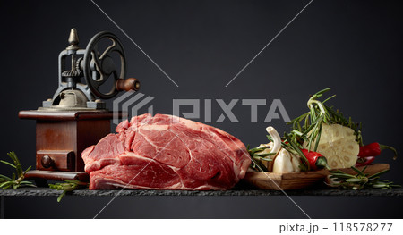 fresh, raw rib eye steak, on a chopping board, top view, no people,