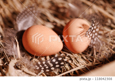 Two brown guinea fowl eggs lie on the straw, next to the feathers