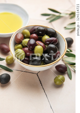 Bowl of assorted olives with olive oil and olive branches on tiled surface