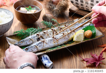 秋の味覚 さんまの塩焼きと栗とお味噌汁とご飯