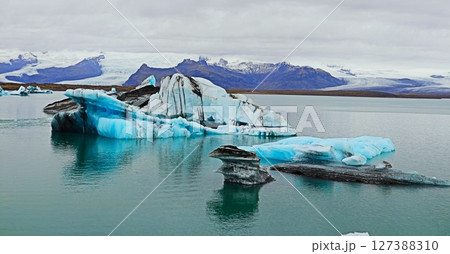 アイスランドの最大の湖、氷河湖であるヨークルスアゥルロゥンに浮かぶ、真っ青に輝く氷山です。