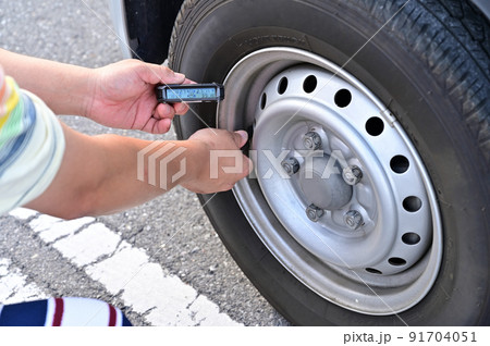タイヤ空気圧モニターを点検する男性 自動車 キャンピングカー